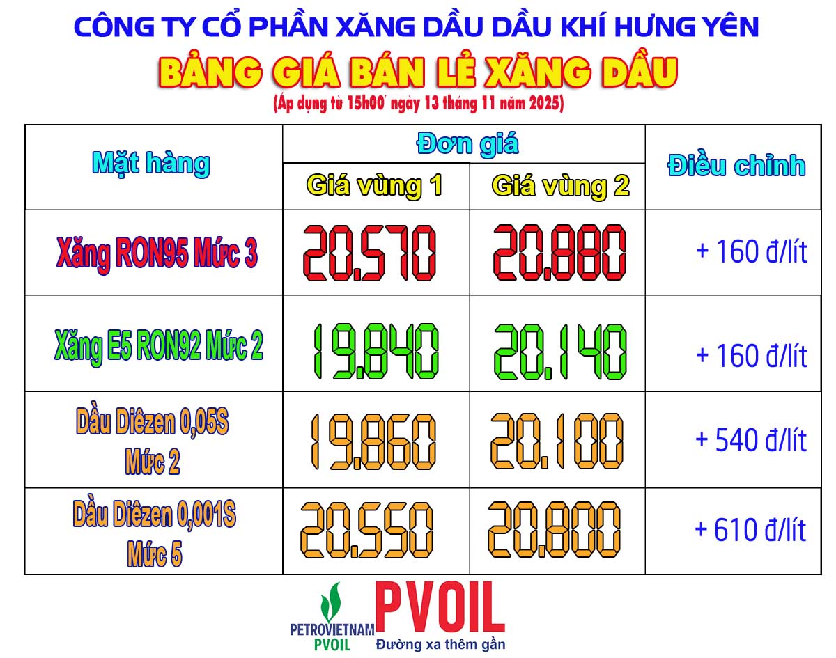 PVOIL điều chỉnh giá bán lẻ xăng dầu từ 15 giờ ngày 13/11/2025