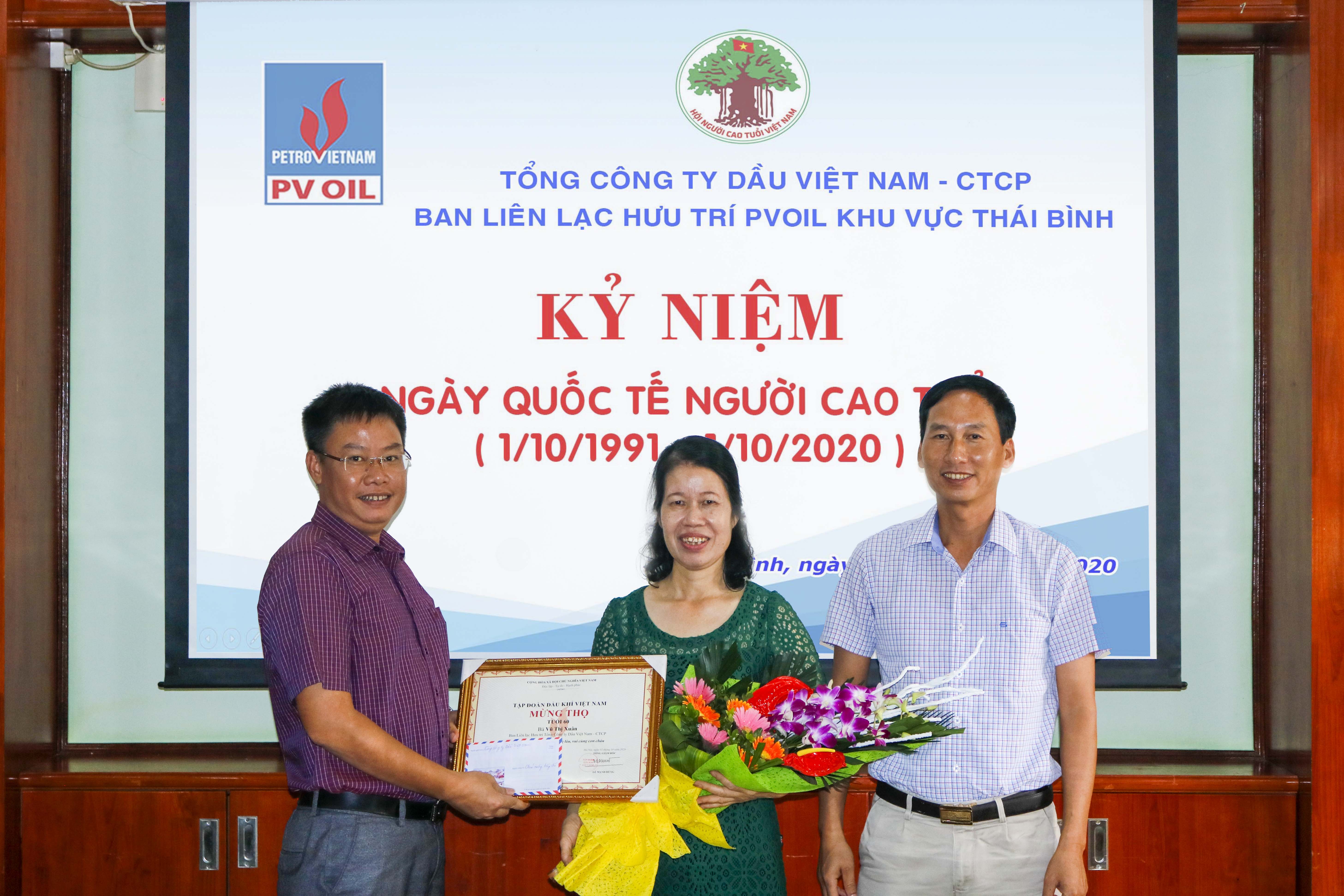 Cũng nhân dịp này, đồng chí Quách Văn Sơn và đồng chí Tràn Đình Thành đã trao giấy mừng thọ của Tập đoàn Dầu khí Việt Nam cho đồng chí Vũ Thị Xuân.